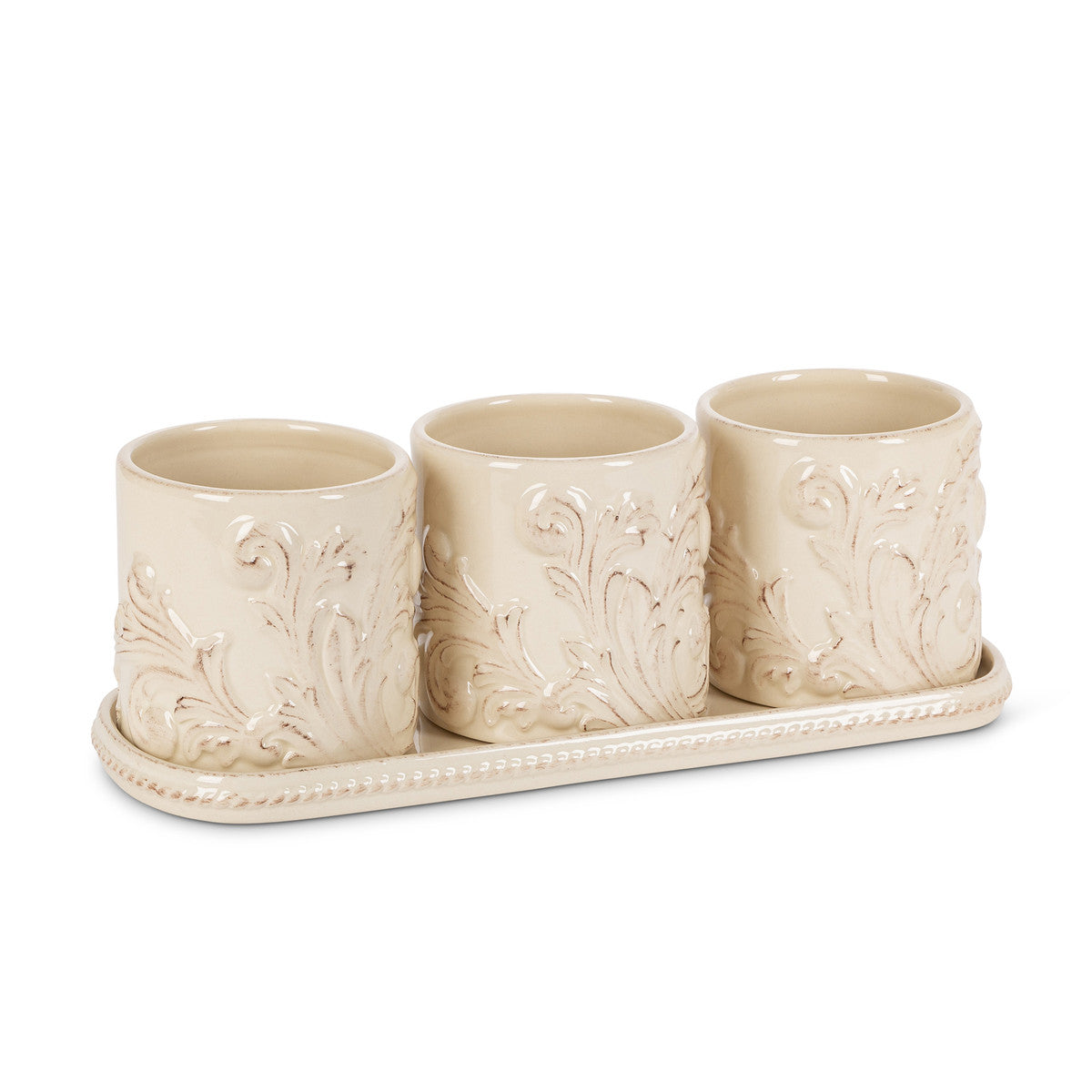 Acanthus Stoneware Herb Pots with Tray, Set of 3 with Tray