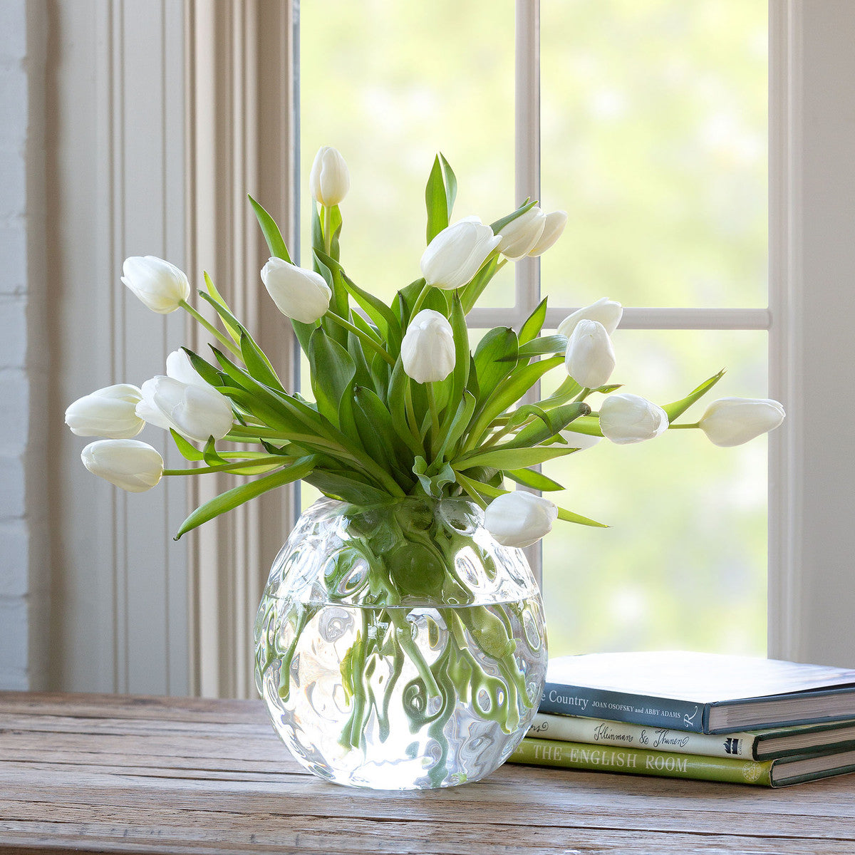Hand-blown in Italy by artisans, each piece is unique in shape due to its organic process. Made by hand, the pattern is created by artist blowing the pattern into the glass. An exquisite vase sure to be a favorite to hold seasonal blooms for years to come.
