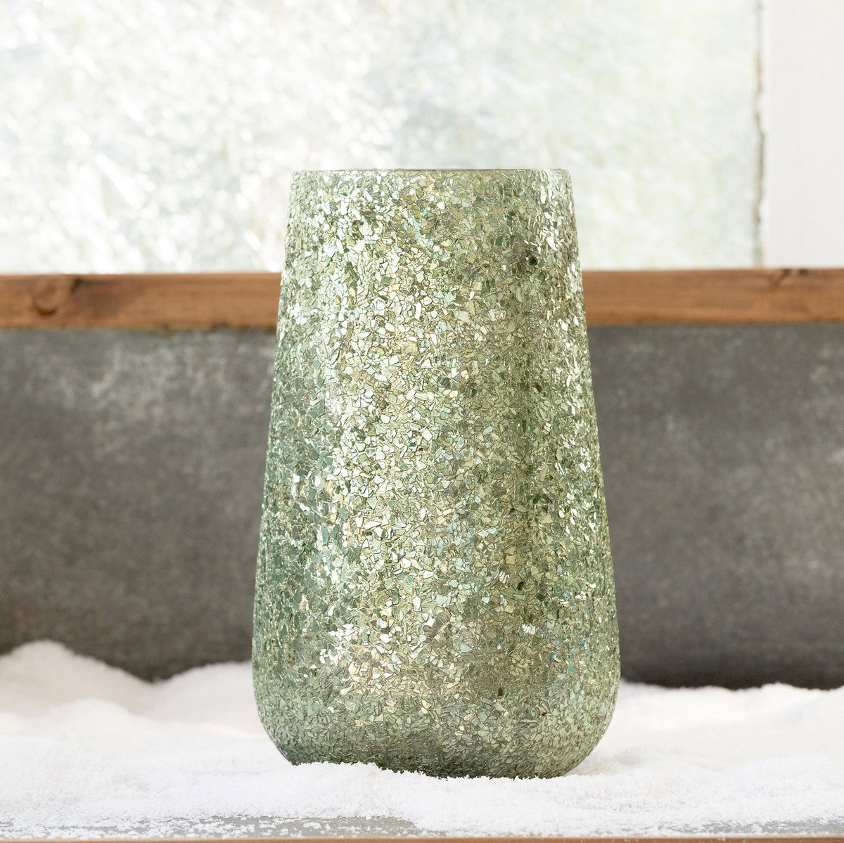 We love to sparkle at the holidays! This green glass hurricane will do just that. Made up of tiny bits of green glass with glitter accents it will be the star of your holiday table.