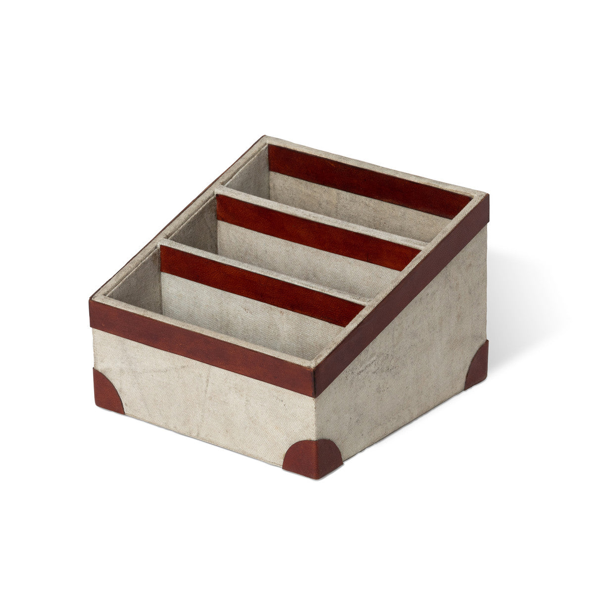These antique canvas desk accessories are made in India of recycled tent canvas trimmed in leather. Functional and sophisticated, the letter holder will keep notepads, mail, tablets, and other essentials organized and at your fingertips. Perfect for home office, entryway, or kitchen.