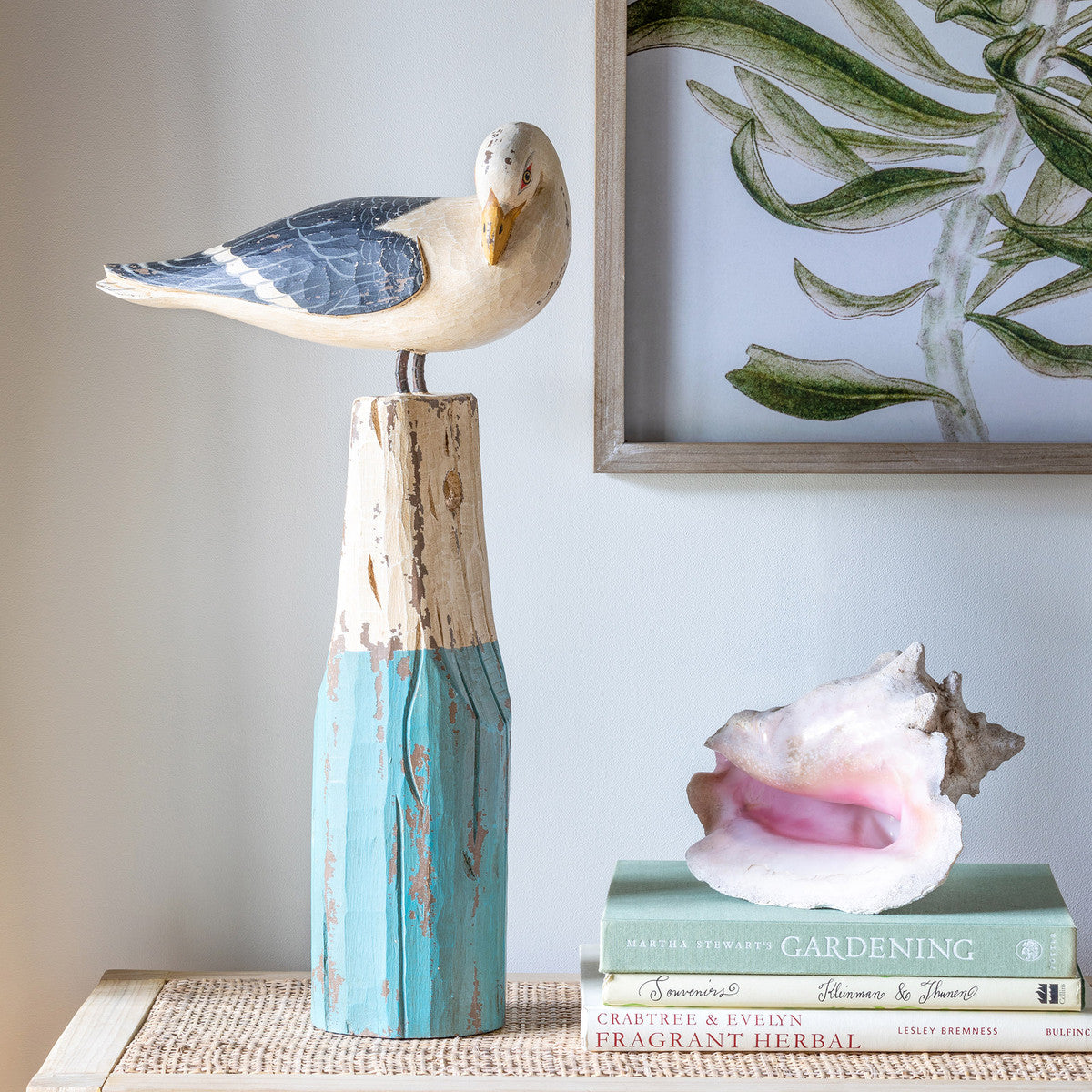 Embrace your wanderlust for the sea with our beechwood carved Black-Tailed Gull on Buoy. This beautiful artisan sculpture is hand painted with oceanic tones of black, white, and turquoise and lightly distressed.