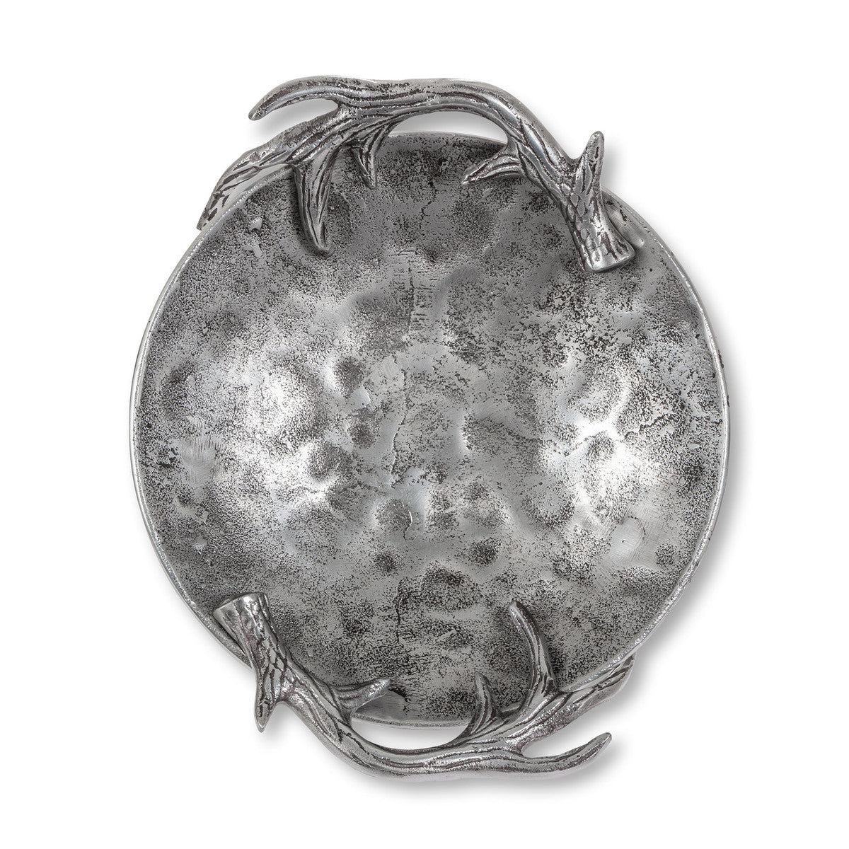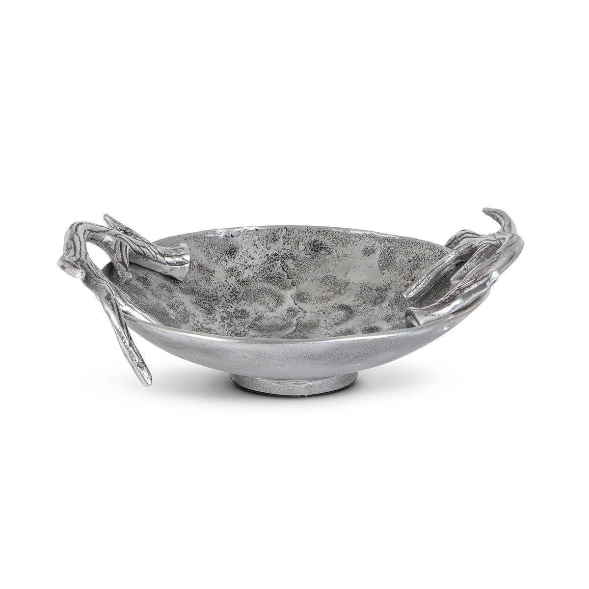 Enhance starter salads and vegetable side dishes by serving them in our Cast Aluminum Hammered Round Bowl. This shallow footed bowl elevates the accompaniment it serves with its distinguished hammered finish and detailed antler handles.