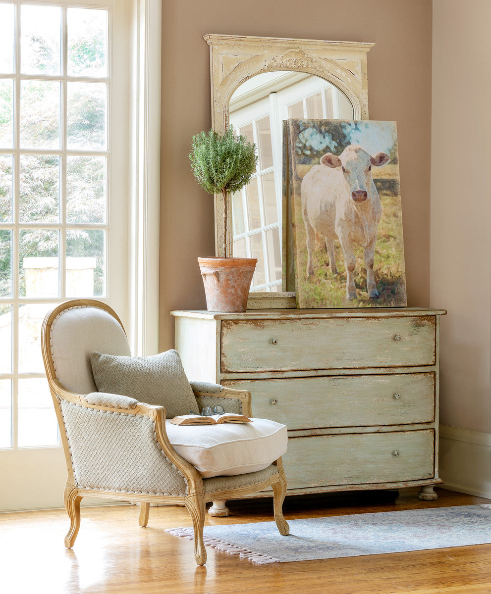 Featuring our original photography, which was reinterpreted in watercolor, then printed and antiqued to add depth, this lovely piece depicts a sweet cow caught in a moment.