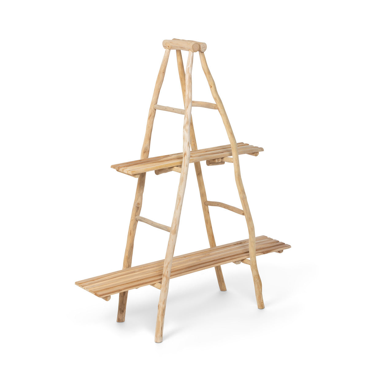 In a rough hewn style, our natural ladder display shelf made of teak is multi-functional. Perfect for plants indoors or out or doubles as a book self. Folds up for easy movability. Comes with 2 removable shelves. A perfect addition to patio or sunroom.