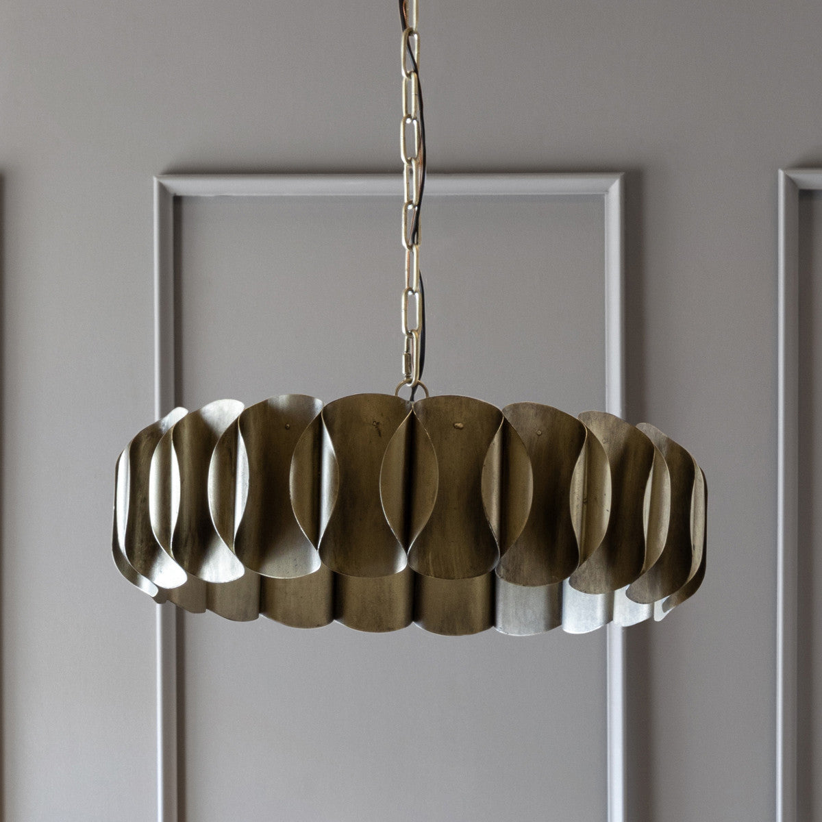 Our Piper Drum Chandelier is an industrial modern fixture. Crafted of bent iron circles, the decorative frame attracts the gaze up to examine its industrial details. Oil-based paint and a waxed finish achieve an aged look on the welded metal panels. At 23” in diameter, this light is ideal hung over a dining table or small seating nook. It comes complete with electrical fittings and 35” chain.