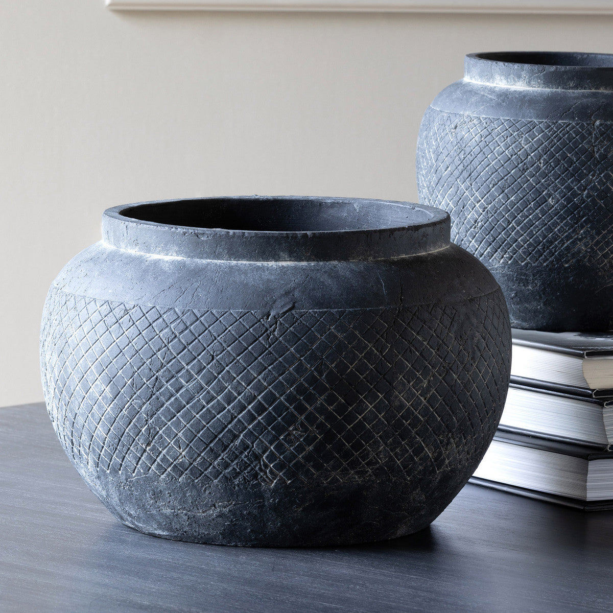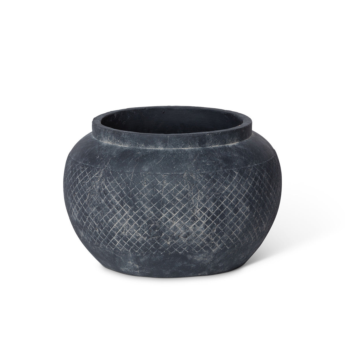 Ideal for a thriving Yucca Cane and detailed with striations reminiscent of its braided fibers, our Yucca Cement Rotund Pot is a bulbous beaut. This black container has a crisscross detailed band around its center, narrowing slightly into a lipped opening which creates a wide, rounded shape optimal for plants with larger roots and outfitted with a drainage hole to prevent overwatering. The purposeful imperfections in the texture and finish of this handmade vessel make it feel almost as ancient as the origin of its namesake, but the color and design keep it modern and new.